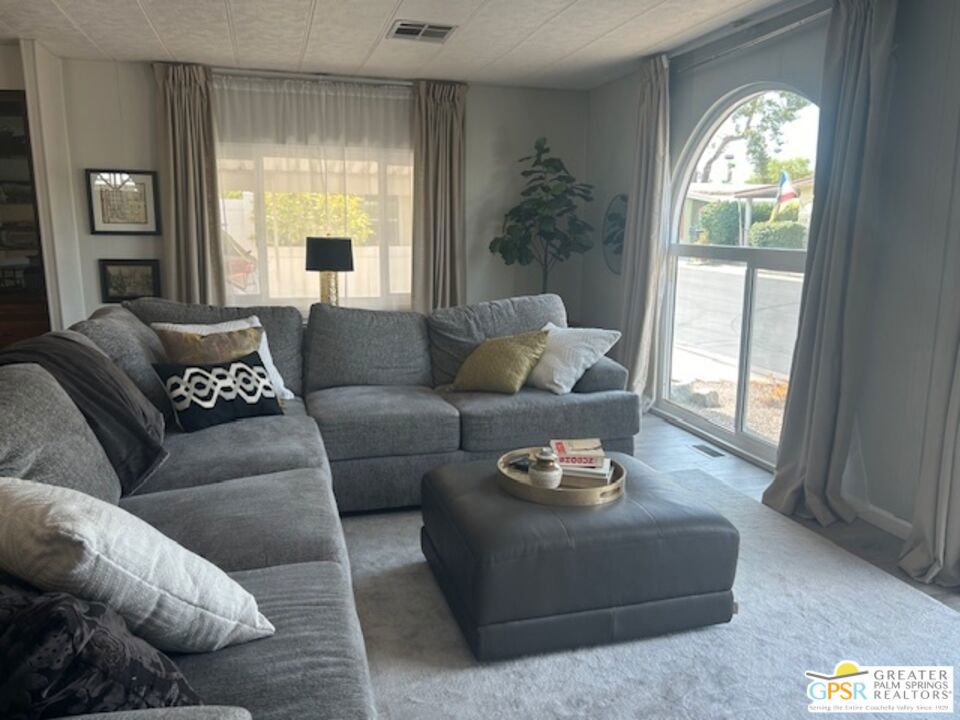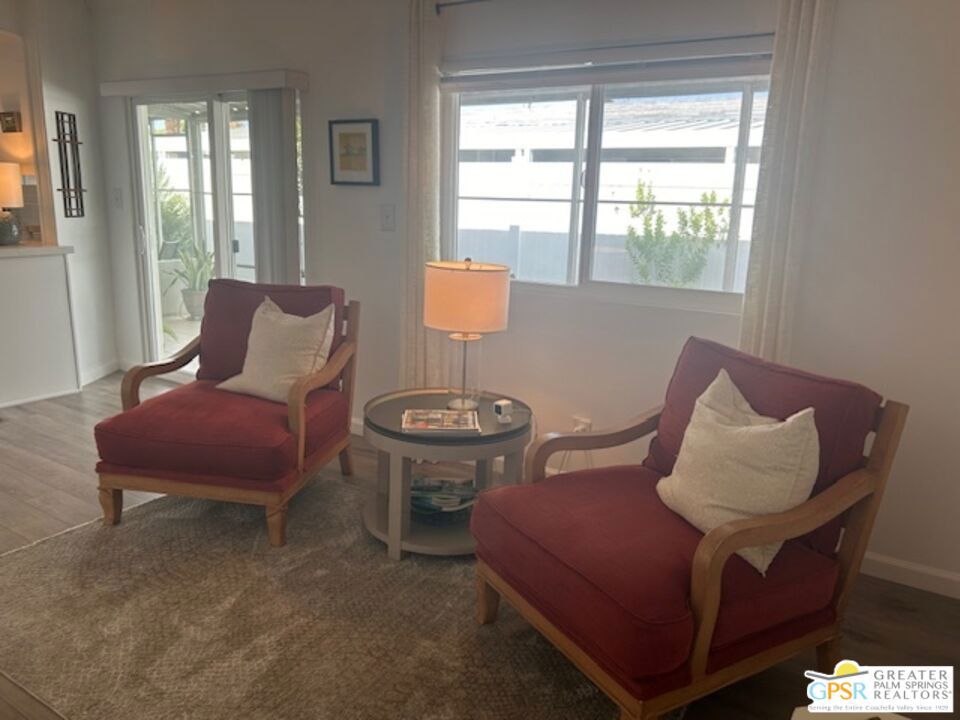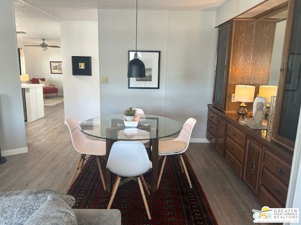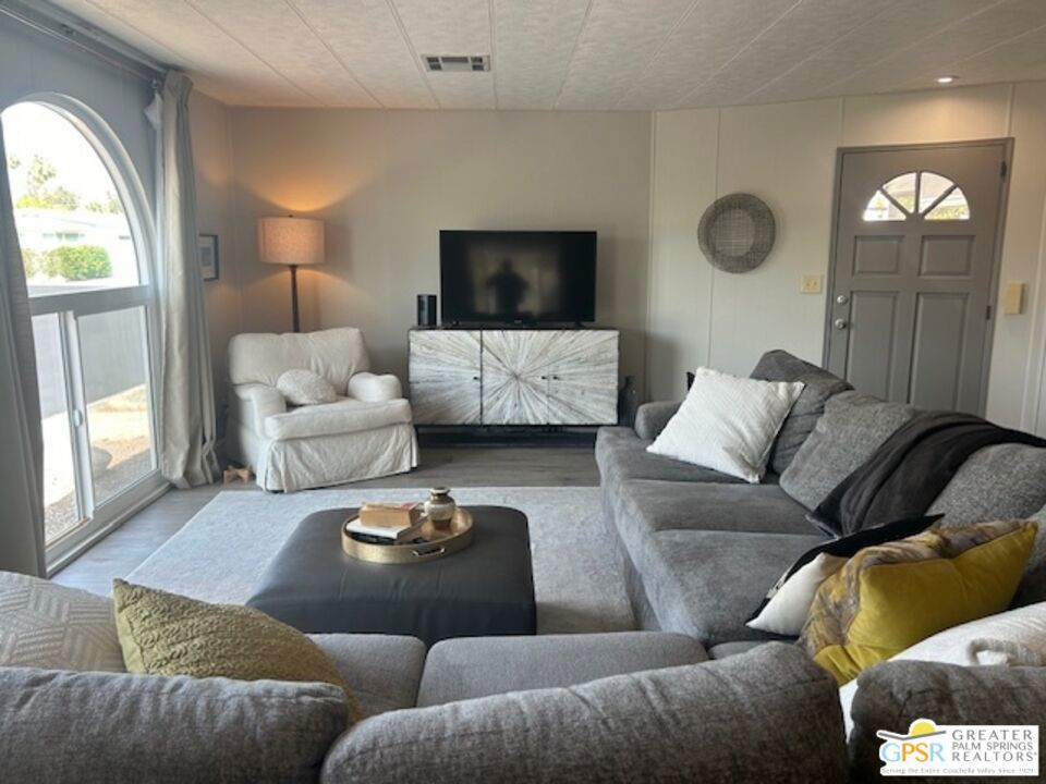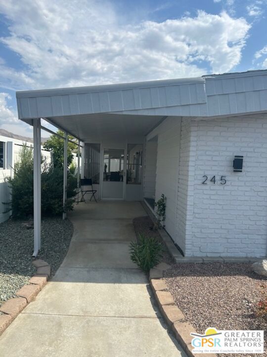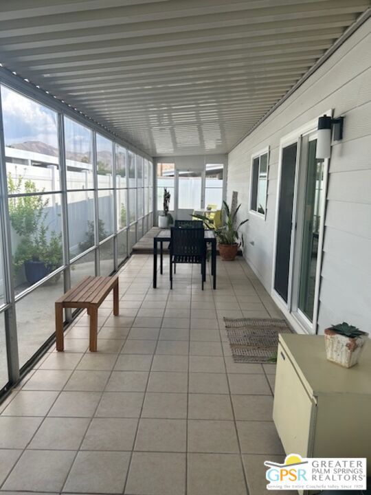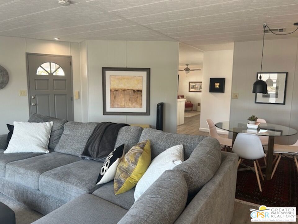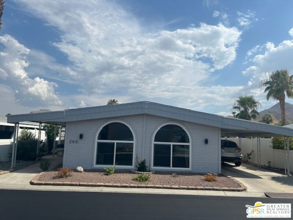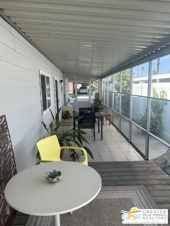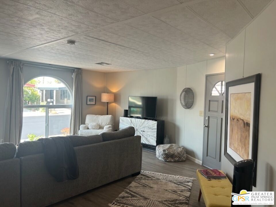 Welcome to El Dorado Palm Springs Estates. A very vibrant senior community of manufactured homes where you own the land. This well maintained two bedroom two bathroom home has been very tastefully decorated with warm colors. The kitchen and bathrooms boasts newer quartz countertops vanities & tub/shower. The updated kitchen has stainless steel appliances. Newer hardwood laminate flooring. The HVAC system is less than one year old. All windows and glass doors are dual pane making this home very energy efficient. A large screened-in porch to enjoy our cool mornings and evening summers. This is a senior (55+) community with gated security, two heated pools plus a large outdoor spa, lighted tennis and pickle-ball courts. The clubhouse has a state-of-the-art fitness center, and a auditorium with a commercial kitchen suitable for catering or special events. Low HOA fees include street maintenance, water, trash pickup, and all common area and clubhouse maintenance. Conveniently located between Palm Springs and Cathedral city and the shopping venues along E. Palm Canyon Drive.