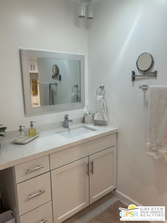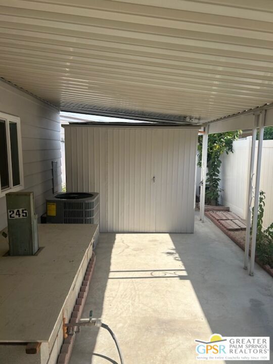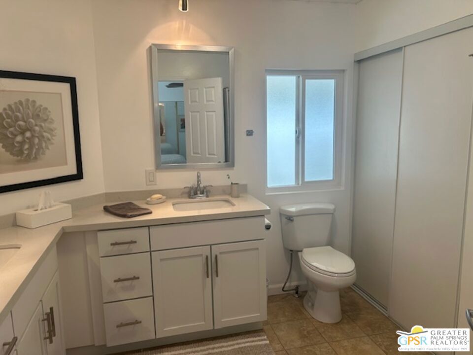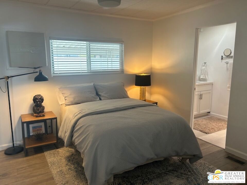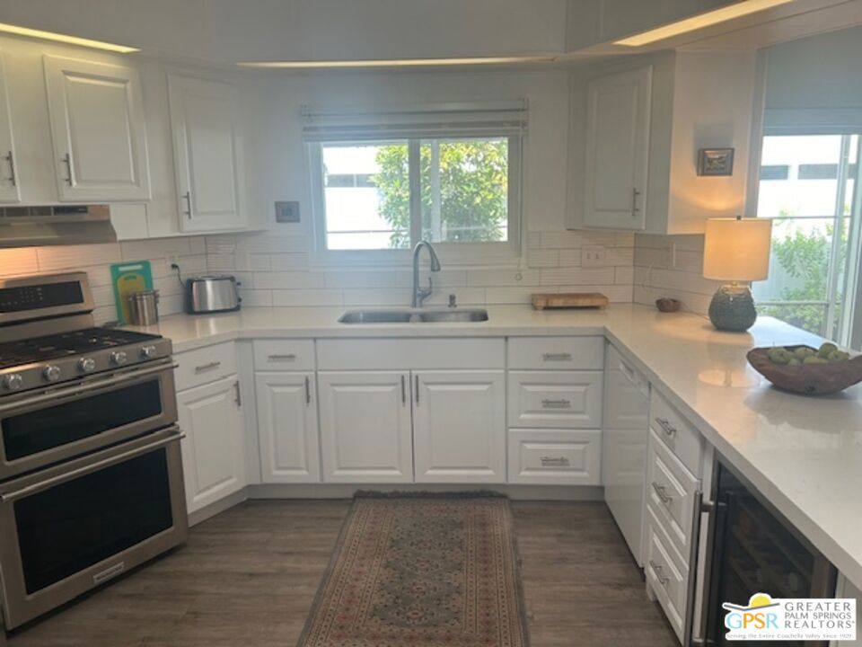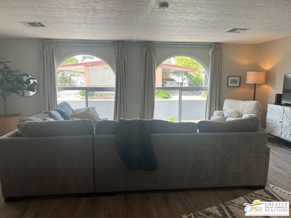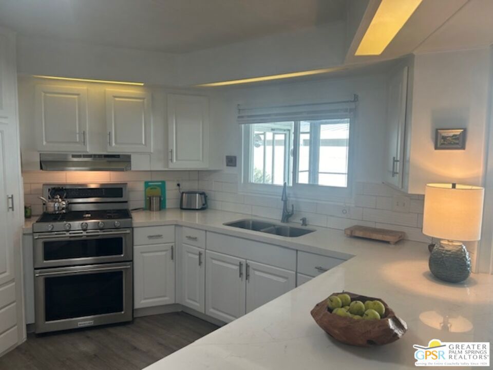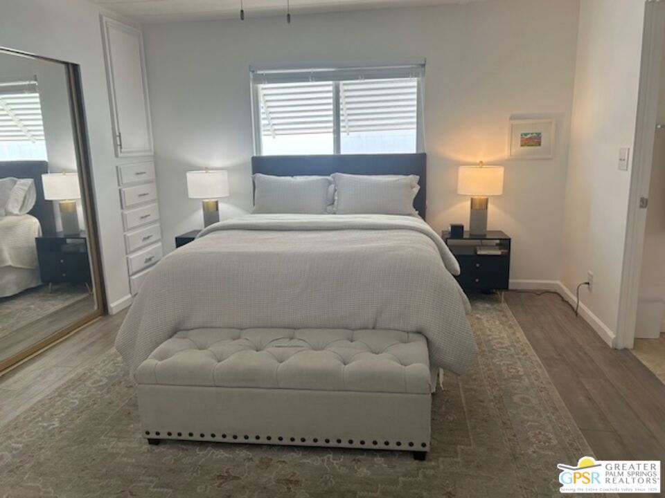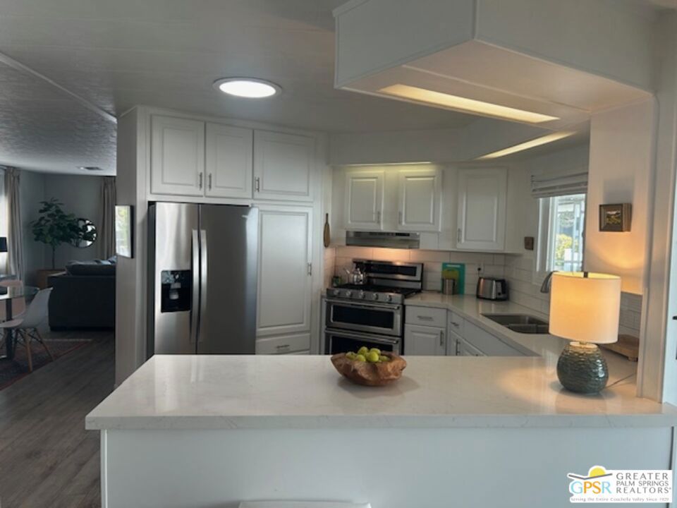 Welcome to El Dorado Palm Springs Estates. A very vibrant senior community of manufactured homes where you own the land. This well maintained two bedroom two bathroom home has been very tastefully decorated with warm colors. The kitchen and bathrooms boasts newer quartz countertops vanities & tub/shower. The updated kitchen has stainless steel appliances. Newer hardwood laminate flooring. The HVAC system is less than one year old. All windows and glass doors are dual pane making this home very energy efficient. A large screened-in porch to enjoy our cool mornings and evening summers. This is a senior (55+) community with gated security, two heated pools plus a large outdoor spa, lighted tennis and pickle-ball courts. The clubhouse has a state-of-the-art fitness center, and a auditorium with a commercial kitchen suitable for catering or special events. Low HOA fees include street maintenance, water, trash pickup, and all common area and clubhouse maintenance. Conveniently located between Palm Springs and Cathedral city and the shopping venues along E. Palm Canyon Drive.