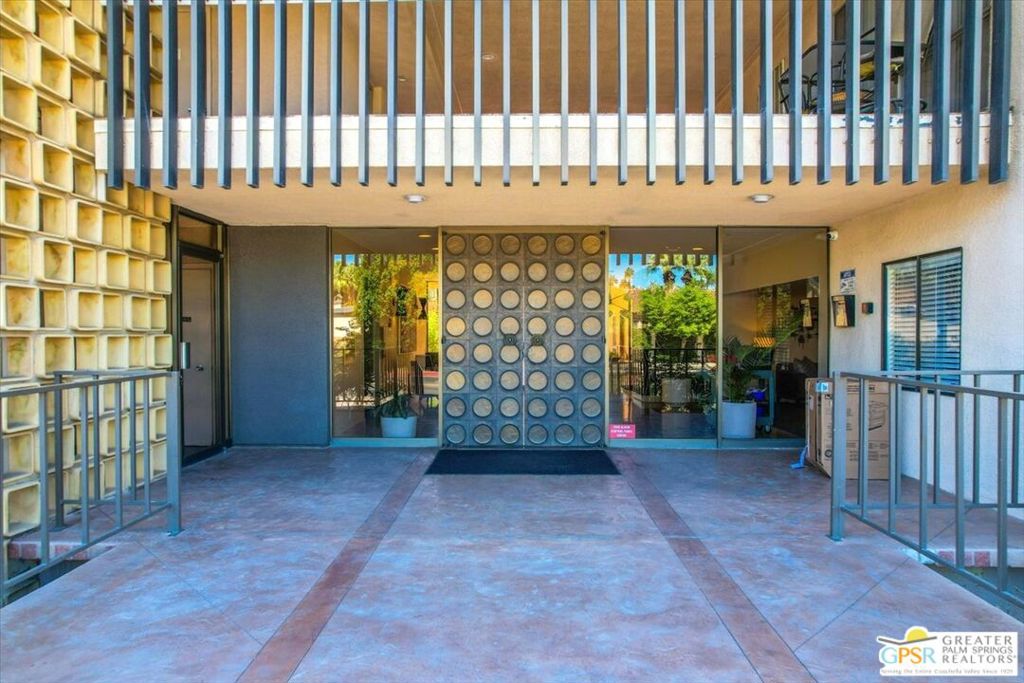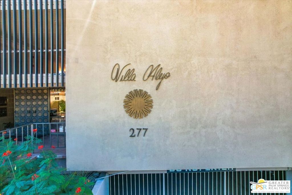 Welcome to Villa Alejo! If you're seeking a move-in ready condo that exudes the famous Palm Springs style, in an architecturally significant building, close to the vibe and natural beauty that defines Palm Springs, look no further. This is the one for you! Walk out your front door to a well maintained courtyard and large pool and spa. This lower floor condo offers a Western view of the mountains and is steps from the Uptown Shopping District. Walk or bike to the many restaurants, bars and fashionable shopping opportunities, entertainment venues, the park, mountain hikes, and a plethora of other amenities. Villa Alejo was built in 1966 and is known with mid-century modern aficionados for its unique screen wall (or Brise soleil), which gives this former hotel its distinctive significance. Number 102 at Villa Alejo has two spacious bedrooms, two bathrooms and a kitchen open to the living area. There is space in the kitchen for a washer and dryer in the unit; a breakfast counter: and plenty of storage. The condo, which is offered turn-key furnished per inventory list, is "move-in ready". One parking spot is included in the secured underground parking garage, with additional parking located in a ground-level parking lot. Storage space, including for bikes is also included at the garage level. A small fitness center and sauna is available to residents. The complex also has conveniently located elevators from the parking garage to your main floor unit. The HOA covers all electricity (including A/C and heating), trash, sewer, water, parking, earthquake insurance and maintenance of the pool, spa and grounds, making this an incredible value. Schedule your showing to to see for yourself the best of Palm Springs living.